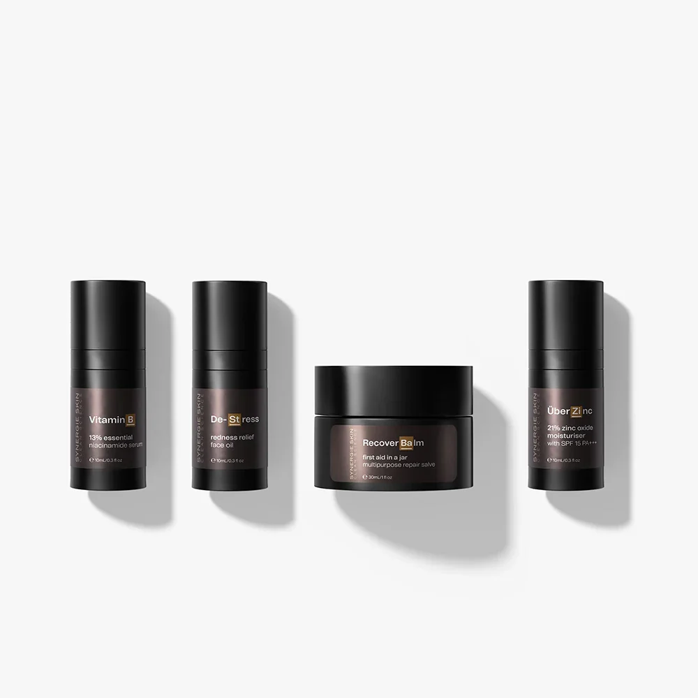Containing your daily UV protective moisturiser with the anti-inflammatory zinc oxide, a niacinamide serum, a calming facial oil, and a restorative skin balm. Allow your skin to rest easy.